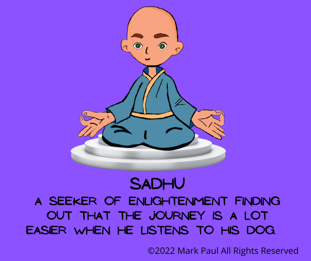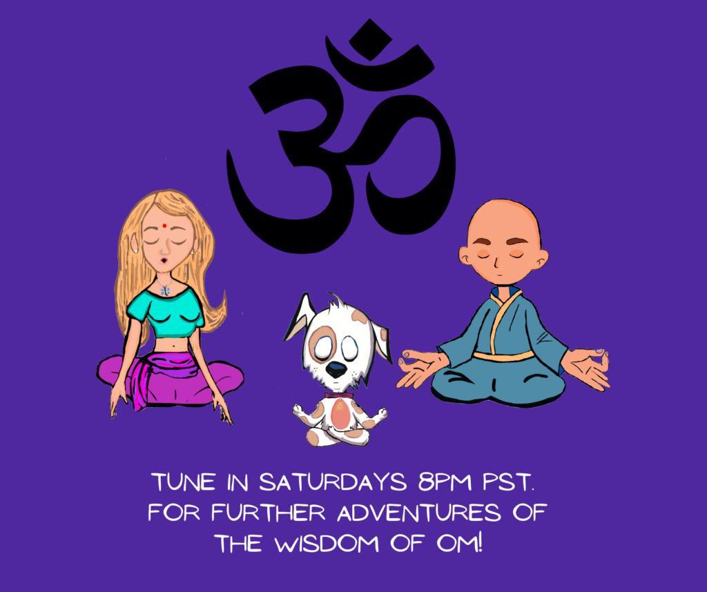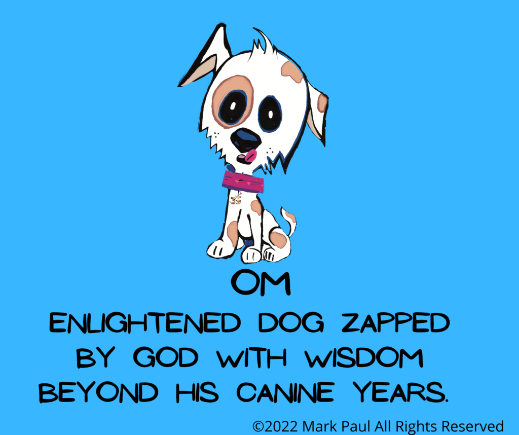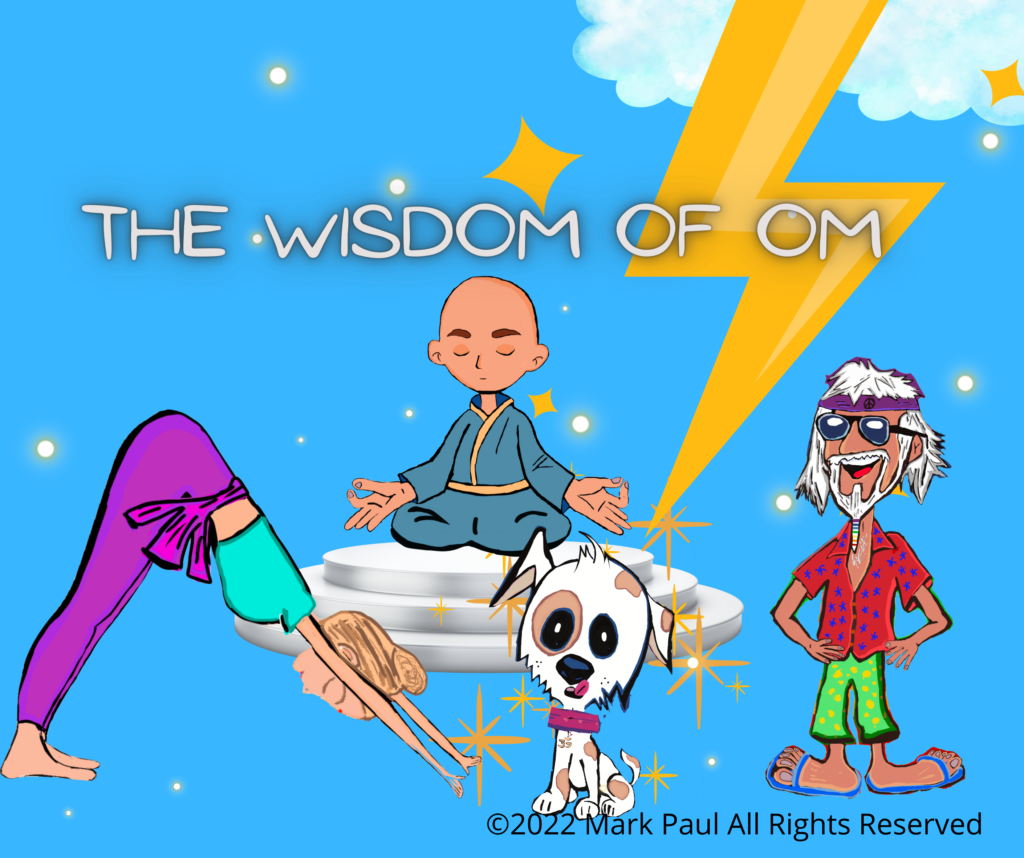 The Wisdom of Om is a comic look at spirituality in the modern age through the eyes, ears, and nose of “Om” an enlightened dog and his pet parents Sadhu, a seeker of truth, and Clare a yoga teacher and spiritual enthusiast. Om was your average dog until one day he climbed to the top of a mountain with Sadhu to meditate. There he was was accidentally struck by a lightning bolt from the Creator, and omniscient imperfect being, who accidentally bestowed OM with all the wisdom of the Universe.
