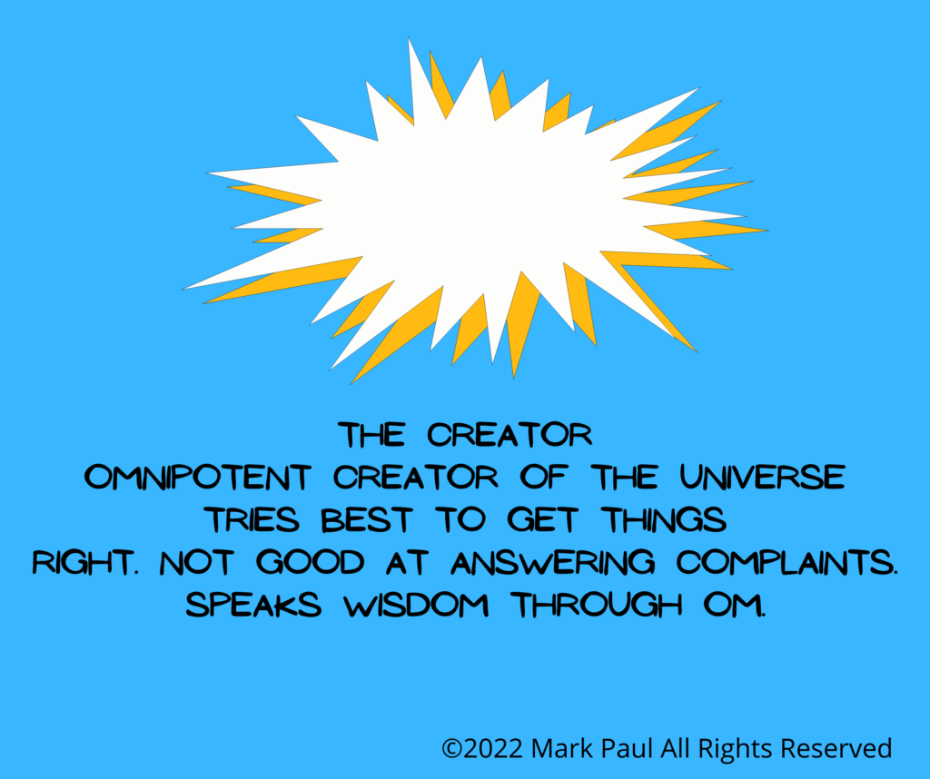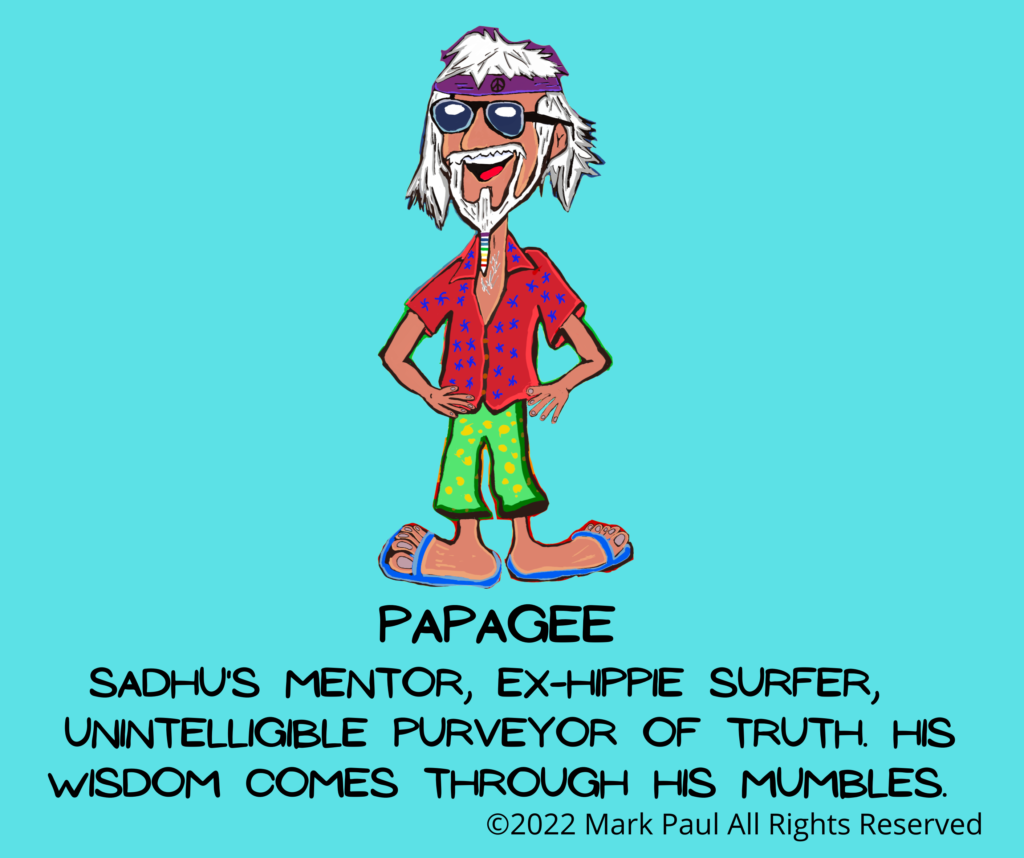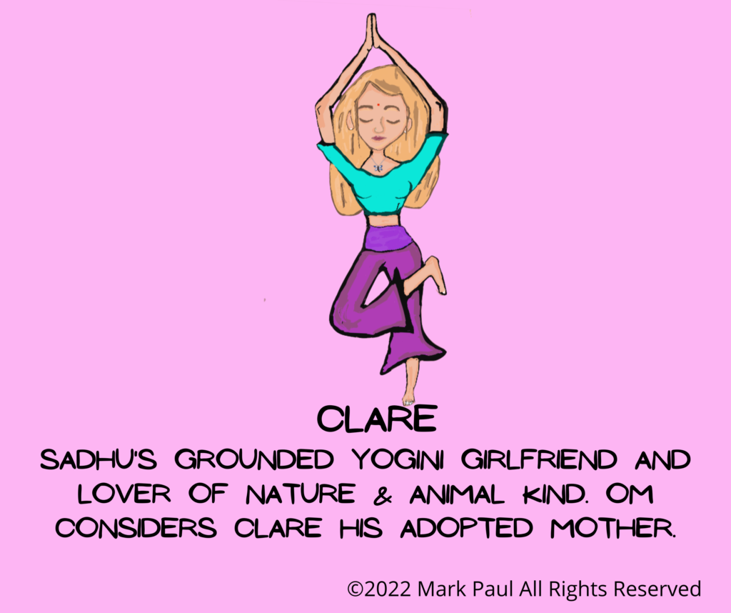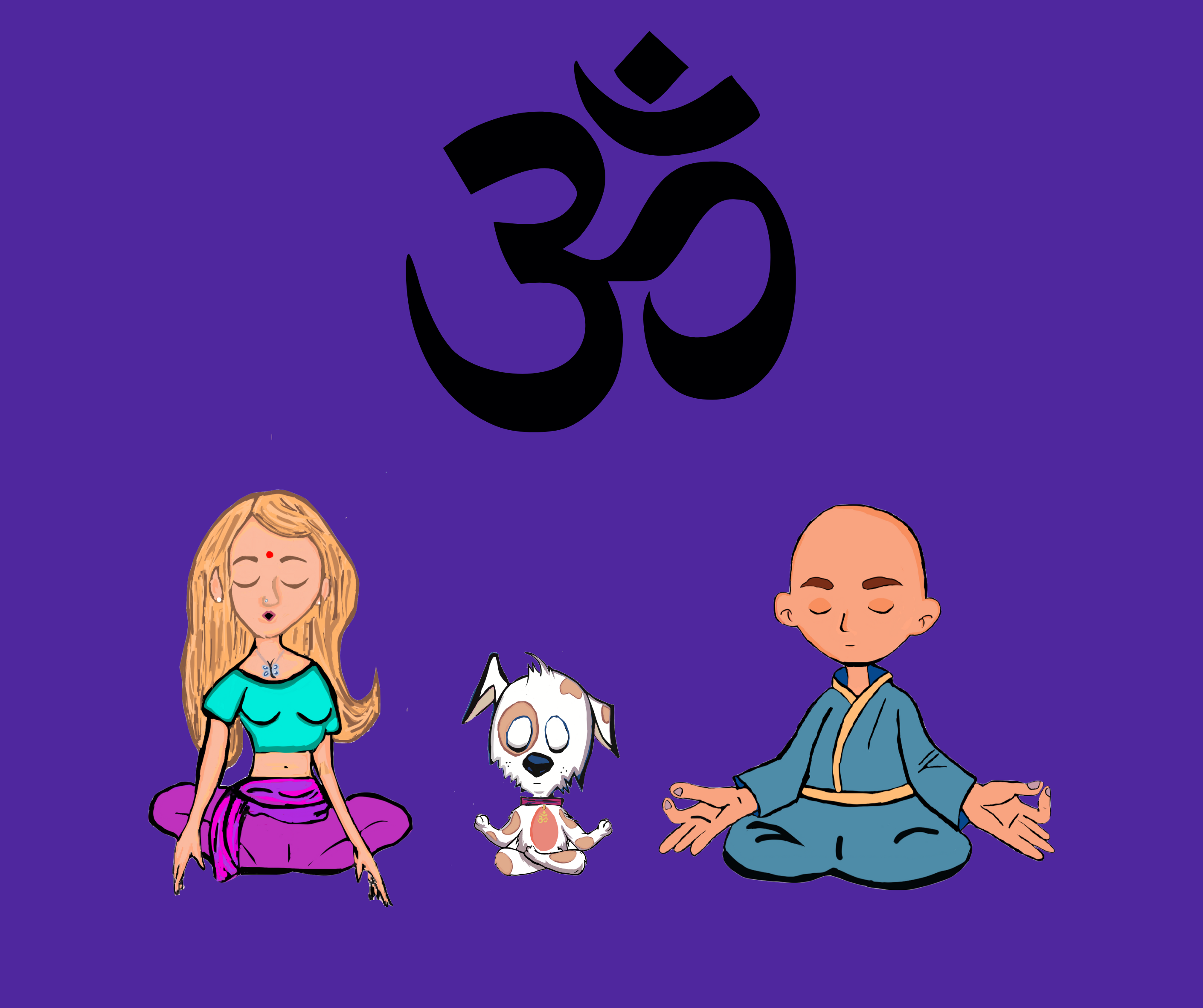 The Wisdom of Om is a comic look at spirituality in the modern age through the eyes, ears, and nose of “Om” an enlightened dog and his pet parents Sadhu, a seeker of truth, and Clare a yoga teacher and spiritual enthusiast. Om was your average dog until one day he climbed to the top of a mountain with Sadhu to meditate. There he was was accidentally struck by a lightning bolt from the Creator, and omniscient imperfect being, who accidentally bestowed OM with all the wisdom of the Universe.